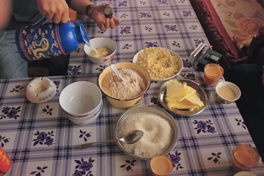 Kết hợp với đồ ăn: Trà bơ thường được uống kèm với tsampa (bột lúa mạch rang), một món ăn truyền thống của Tây Tạng. Sự kết hợp này không chỉ ngon mà còn giúp bạn cảm nhận được sự hài hòa trong ẩm thực Tây Tạng.